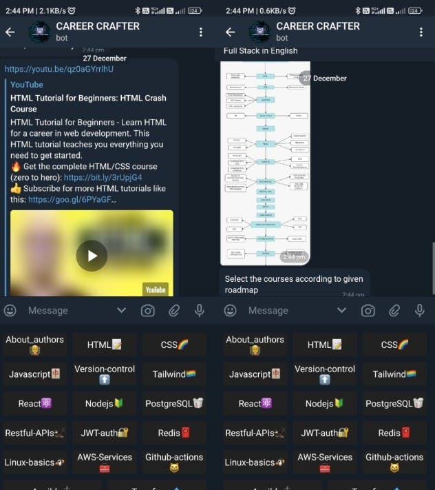 - For those interested in frontend development, the bot will provide a roadmap covering HTML, CSS, JavaScript, and popular frontend frameworks. Responsive design and user interface principles will be emphasized.